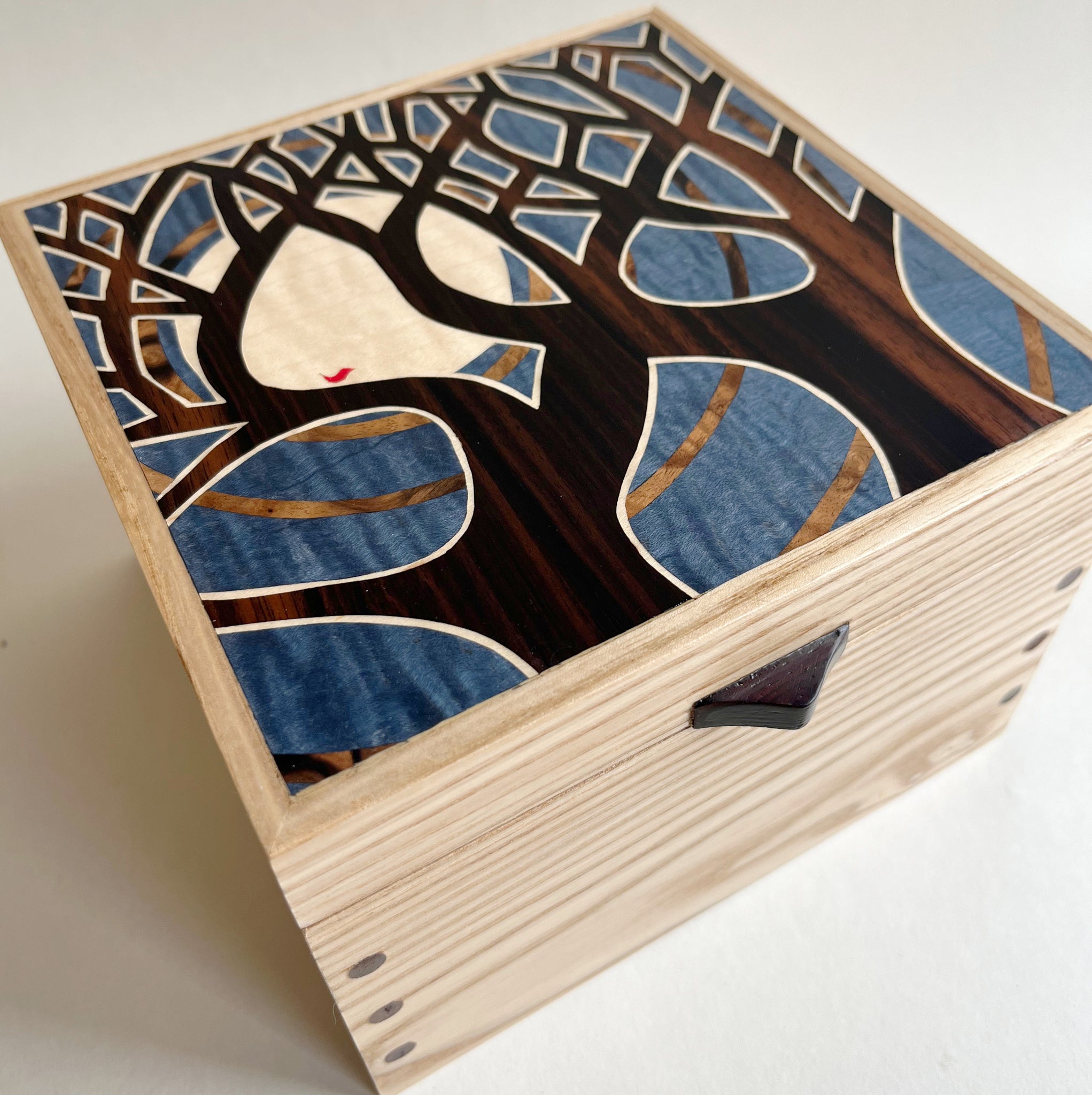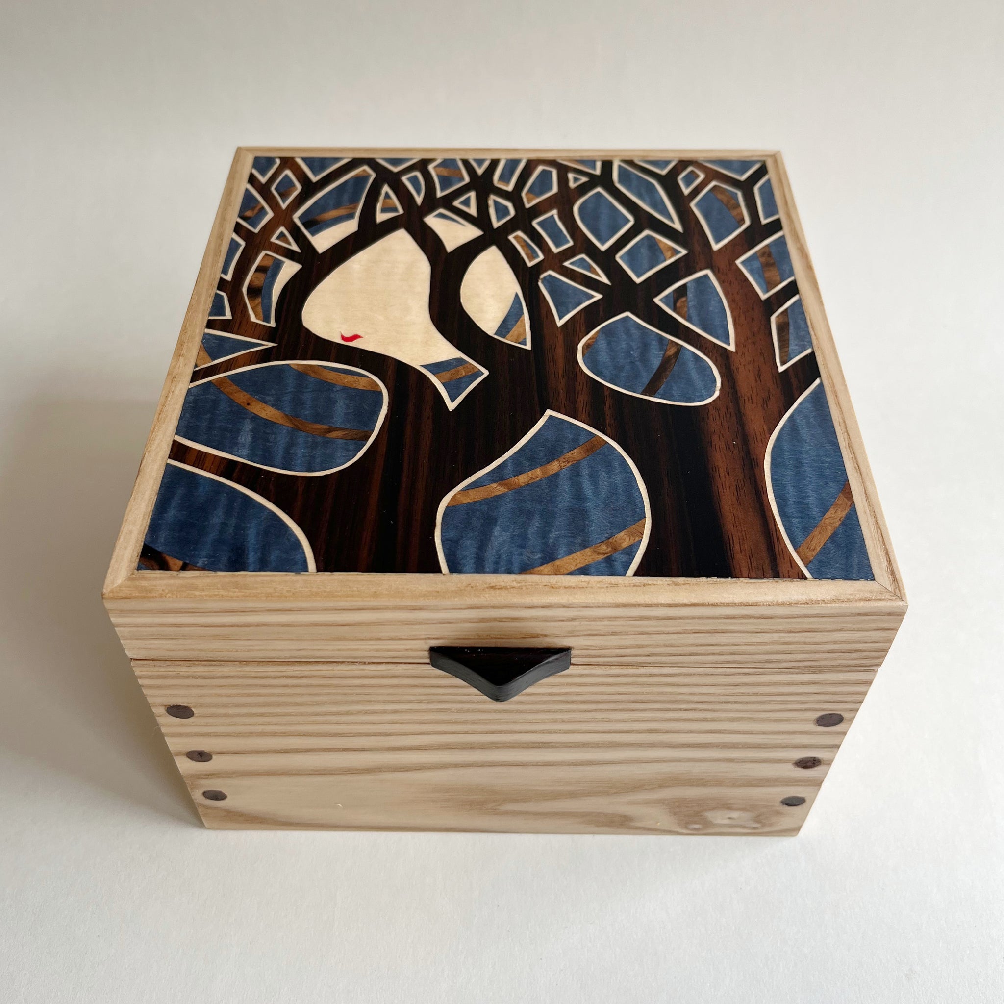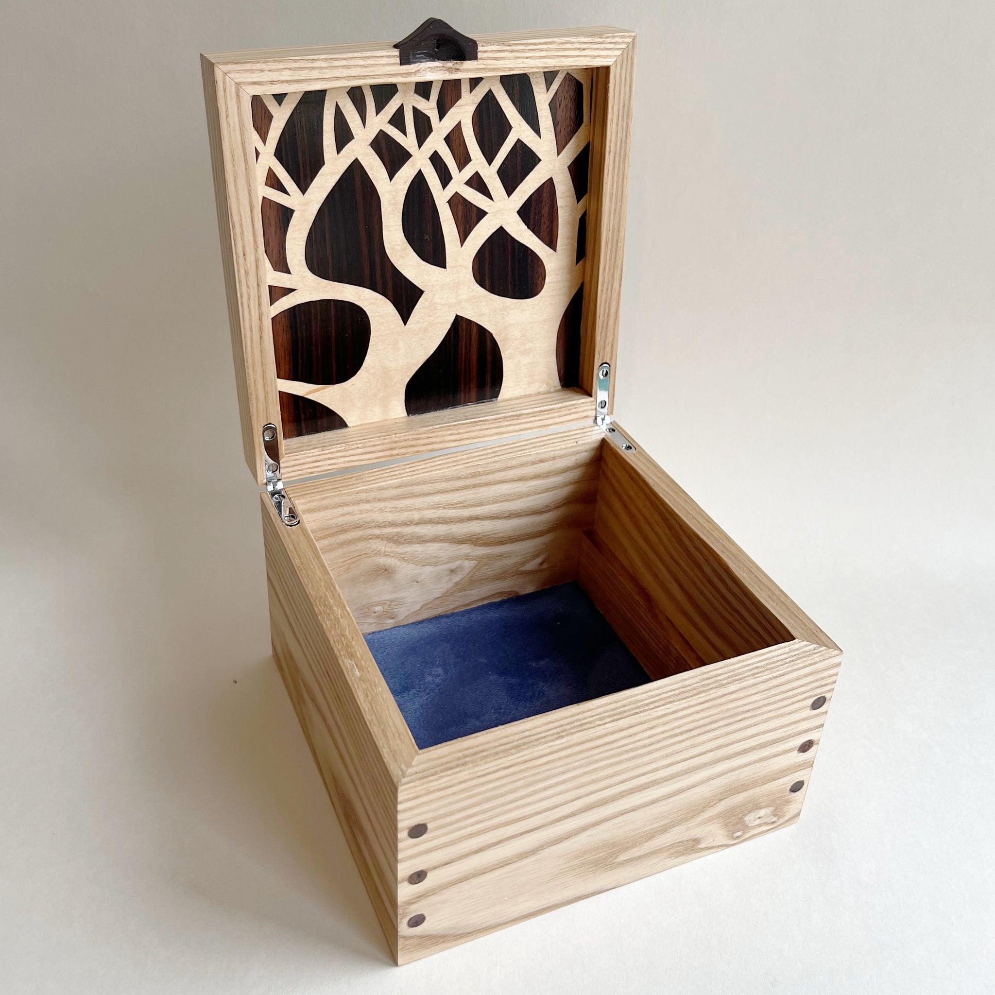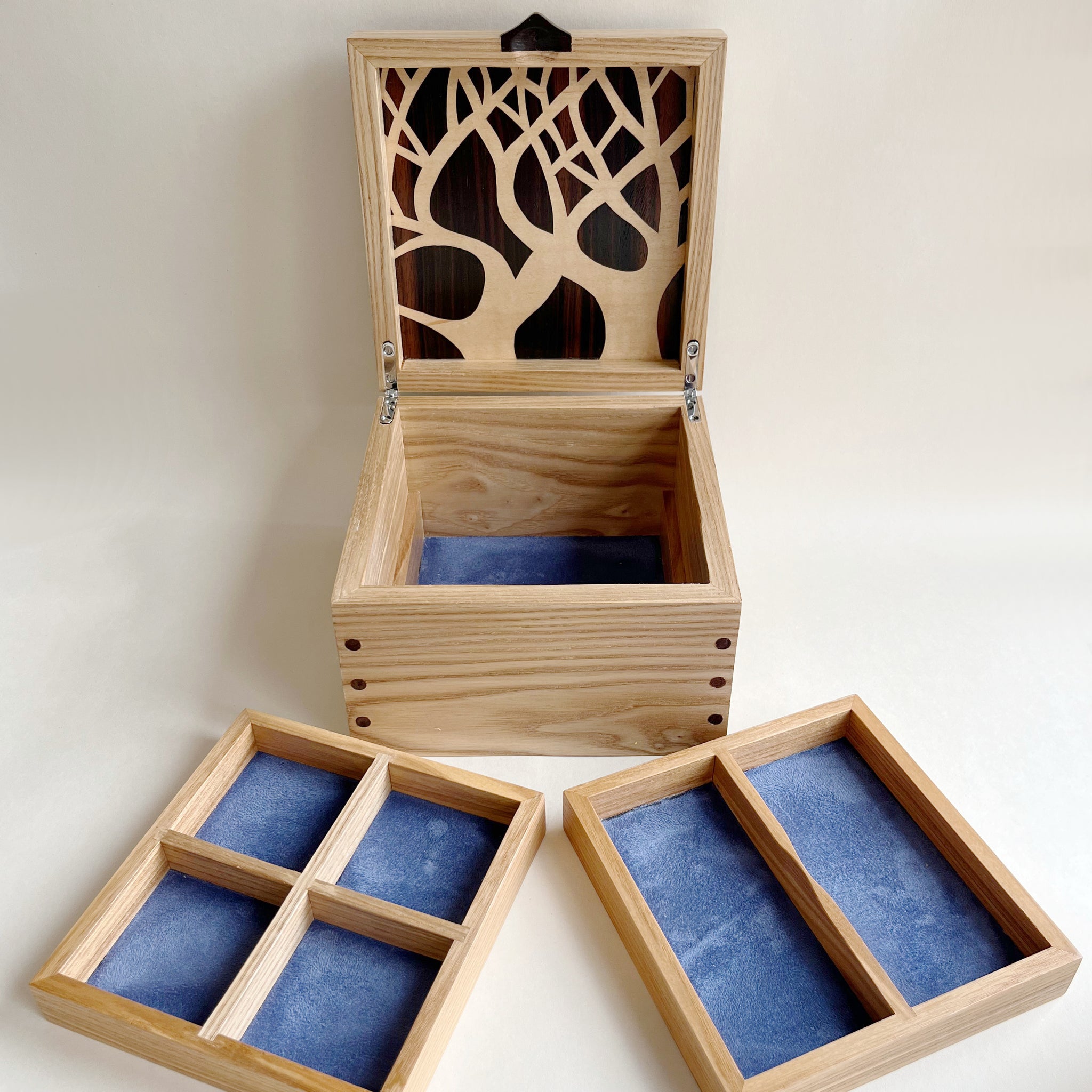 This beautiful wooden jewellery box has been lovingly handcrafted from solid Ash. The striking Moonlit Trees marquetry pattern on the lid of the jewellery box has been intricately hand cut from Sycamore, Macassar Ebony, Walnut Burl and coloured Sycamore veneers.